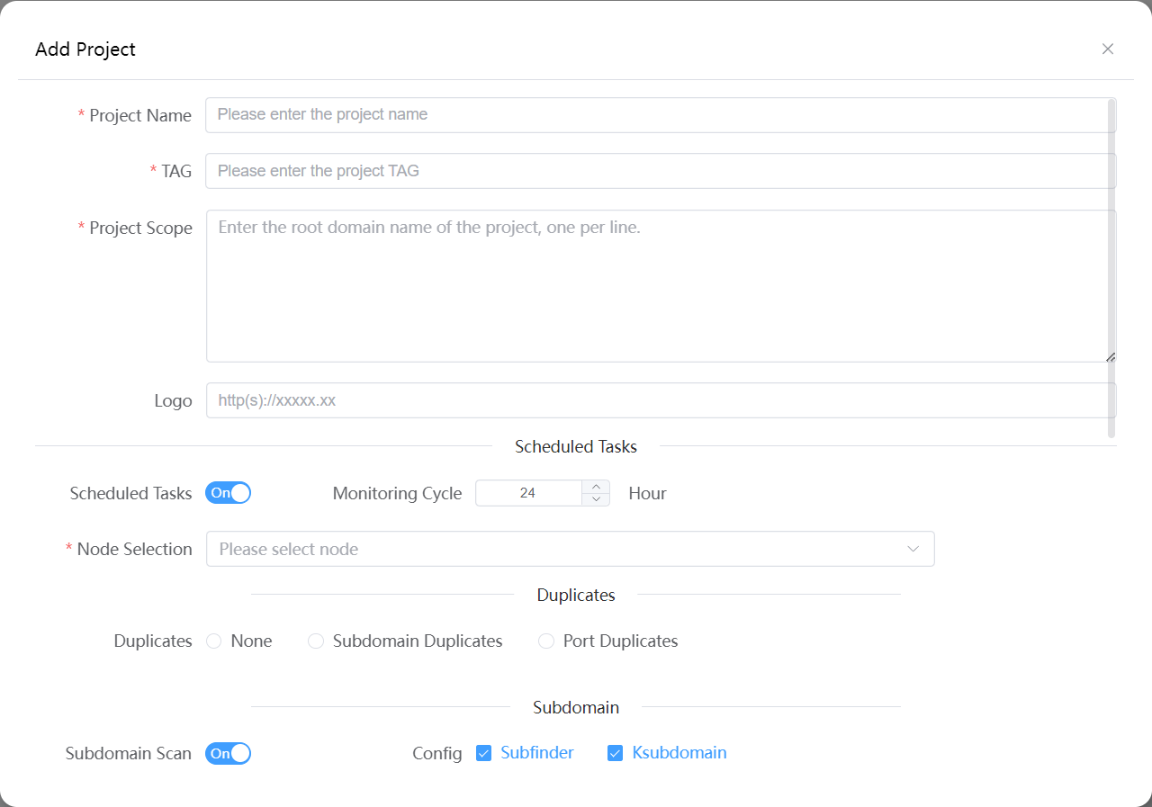 Project scope: the system will extract the root domain name of each row of targets, all scanned assets will match the root domain name and then mark the assets to which they belong, and then they can be searched on the asset page. Update asset returns will synchronize the asset ownership of the scan results.